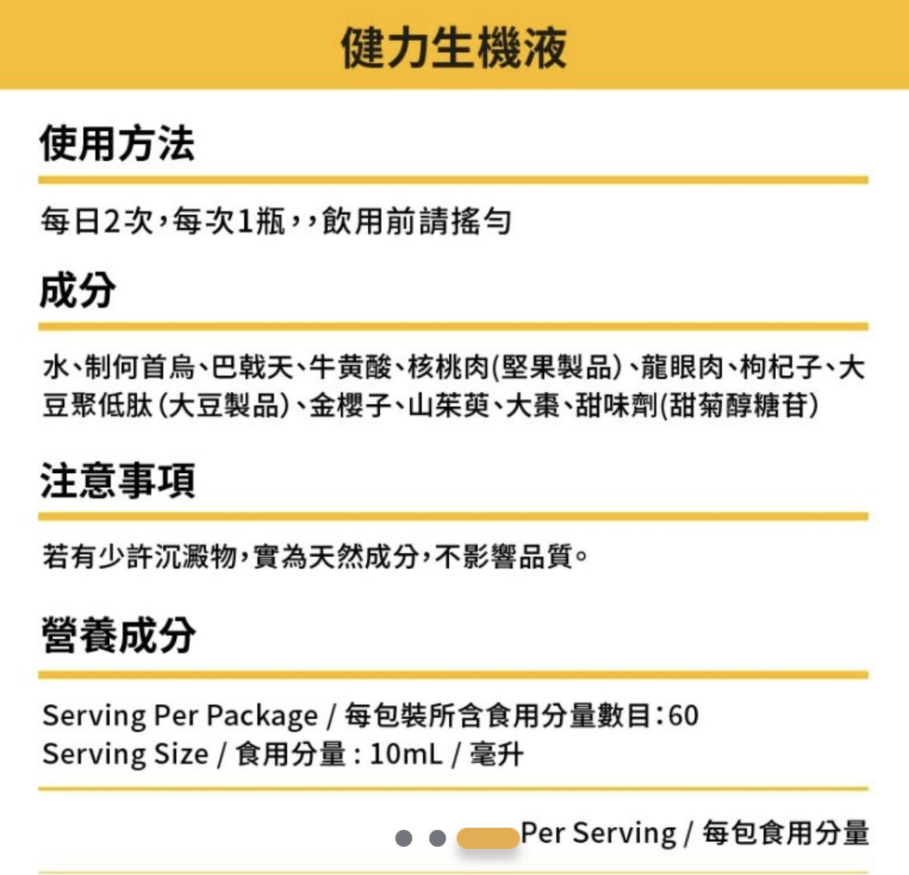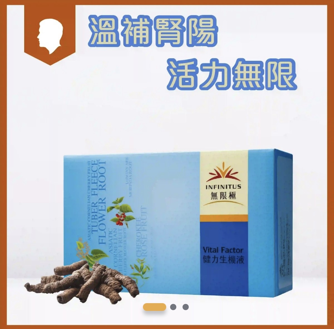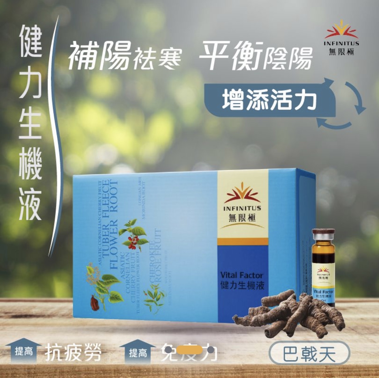 產品介紹 主要功能 補陽袪寒,平衡陰陽 人體「小太陽」- 健力生機液 溫補腎陽,增強能量,猶如在體內升起一輪小太陽 有效改善各種陽虛症狀 盡收1,000多個天地日月精華的高要巴戟天 遵循古法種植,山泉水灌溉,手工除草,一株一株悉心照料 生長週期長達4-6年,盡收天地日月精華 滋補強身、緩解體力疲勞的雙重保健功能 使用方法 每日2次,每次1支,飲用前請搖勻 成分及包裝劑型 制何首烏、巴戟天、牛黃酸、核桃肉(堅果製品)、龍眼肉、 枸杞子、大豆聚低肽(大豆製品)、金櫻子、山茱萸、大棗 產品包裝:10毫升 × 60支