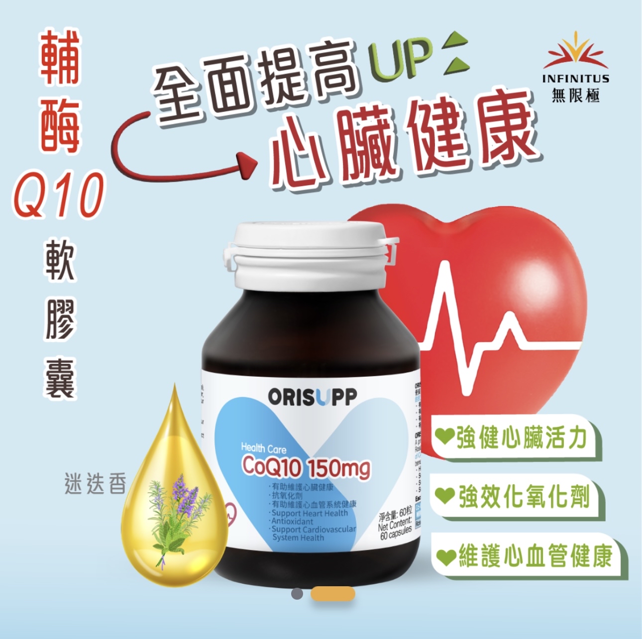 產品介紹 輔酶 Q10 是身體的「發電機」,有助維持身體機能。足夠的輔酶Q10或有助保持心血管健康,令心臟更強健活力。 心有力.新動力•滿活力 每日1粒、輕鬆補充150mg 5大特點 ◆ 強健心臟 | 活力十足 保持血管彈力和暢通和維護心腦血管系統健康 ◆高抗氧化| 延緩衰老 添加迷迭香油,協同輔酶 Q10發揮抗氧化能力,清除身體自由基,維護心腦血管系統健康 ◆啟動能量| 維持身體機能 將食物能量轉化為人體能量的「發電機」,去維持人體日常機能 ◆天然好吸收|採用微生物發酵 比化學合成法更安全有效,而且微生物活性高,更容易被人體吸收 ◆澳洲原瓶進口、多重官方認證 *如無醫生建議,請勿在華法林療程期間服用本產品 *再對服用心臟藥物作出任何改變之前,請先諮詢醫生 *此產品沒有根據《藥劑業及毒藥條例》或《中醫藥條例》註冊。為此產品作出的任何聲稱亦沒有為進行該等註冊而接受評核。此產品並不供作診斷、治療或預防任何疾病之用。 注意事項:兒童、孕婦及哺乳期婦女,患病或身體不適期間請先諮詢醫生或專業人士意見方可食用。產品功效因人而異,圖片只供參考一切以實物為準。 成分及包裝劑型 輔酶Q10、迷迭香油等 產品包裝:60粒