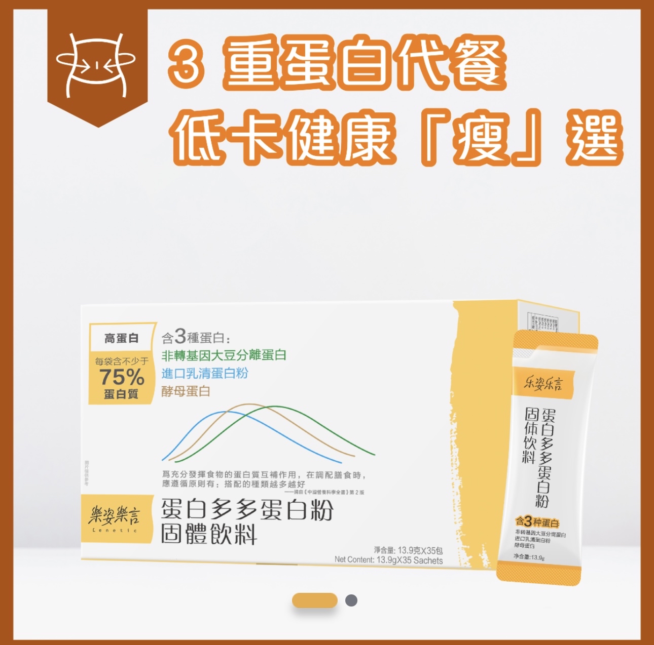 產品介紹 3 重蛋白代餐 低卡健康「瘦」選 3大特點 ◆75% 高蛋白、低糖、低卡配方 每包含 ≈ 10g 蛋白質 低熱量 = 60 kcal(千卡路里) ◆甄選 3 種蛋白 l 延長飽腹感 科學補充蛋白質,綜合 3 種蛋白更營養,更能發揮蛋白質的特性,使體內氨基酸互補,有助身體吸收和增加飽腹感 ◆添加藥食同源成分(茯苓、薏苡仁) 健脾祛濕 、利水消腫 *請按照產品上的說明服用或使用,產品功效因人而異,圖片只供參考一切以實物為準。 成分及包裝劑型 乳清蛋白粉、大豆分離蛋白、酵母蛋白、茯苓粉、薏苡仁粉等 產品包裝:35包/盒