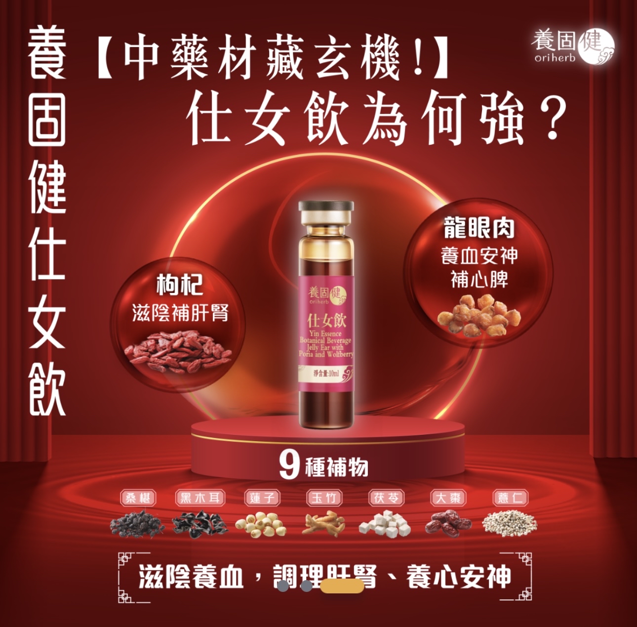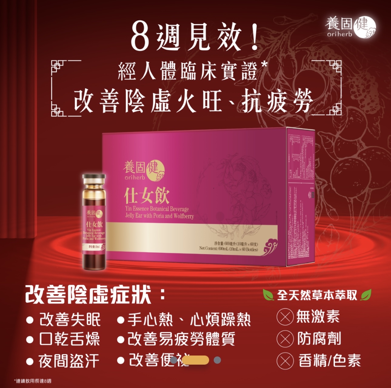 產品介紹 凍齡養生《滋陰、養宮、養血氣》 以藥食同源經典方劑《杞圓膏》為產品開發理念。獨特中草藥組方配搭 8 款甄選藥食同源原料及現代技術(複合多醣),精製而成。經功能實驗,有助養血安神、延緩衰老、養宮及調整免疫。 ◆ 適合人群(此產品是健康食品,適合大眾食用,特別適合以下人群) • 月經不順 • 陰虛體質 • 肝腎不足 • 情緒不定 • 更年期 ◆ 純素食來源 l 更安全、健康 無激素、香精、色素及防腐劑 科普知識 - 【陰陽調和 l 生生不息】 中華養生理念講求天人合一、陰陽平衡,認為須平衡身體內健康與外在環境,體內各臟腑健康才能保持最佳狀態。體內陰陽不協調,便衍生出寒熱、虛實的不同偏性體質。 簡單而言,陰虛症狀為便秘、咽乾、皮膚乾燥等,陽虛則表現為易倦怕冷、唇色蒼白等。 科普知識 - 【 為何養官和養血氣可抗衰老?】 「養宮」是指調理和滋養女性生殖系統(月經、子宮、卵巢等),改善身體營養供應和血液循環,養好氣血才能延緩衰老。 *實際效果因人而異。注意事項:本品含有大豆製品。兒童、孕婦及哺乳期婦女,患病或身體不適期間請先諮詢醫生或專業人士意見方可食用。此乃日常生活保健食品,並非醫藥品,亦不具醫療功效,產品功效因人而異,圖片只供參考一切以實物為準。 每日2-3次,每次1支,飲用前請搖勻。 成分及包裝劑型 枸杞、桂圓 、黑木耳 、薏苡仁 、茯苓、蓮子、大棗、桑椹等 產品包裝:60支/盒(10毫升/支)