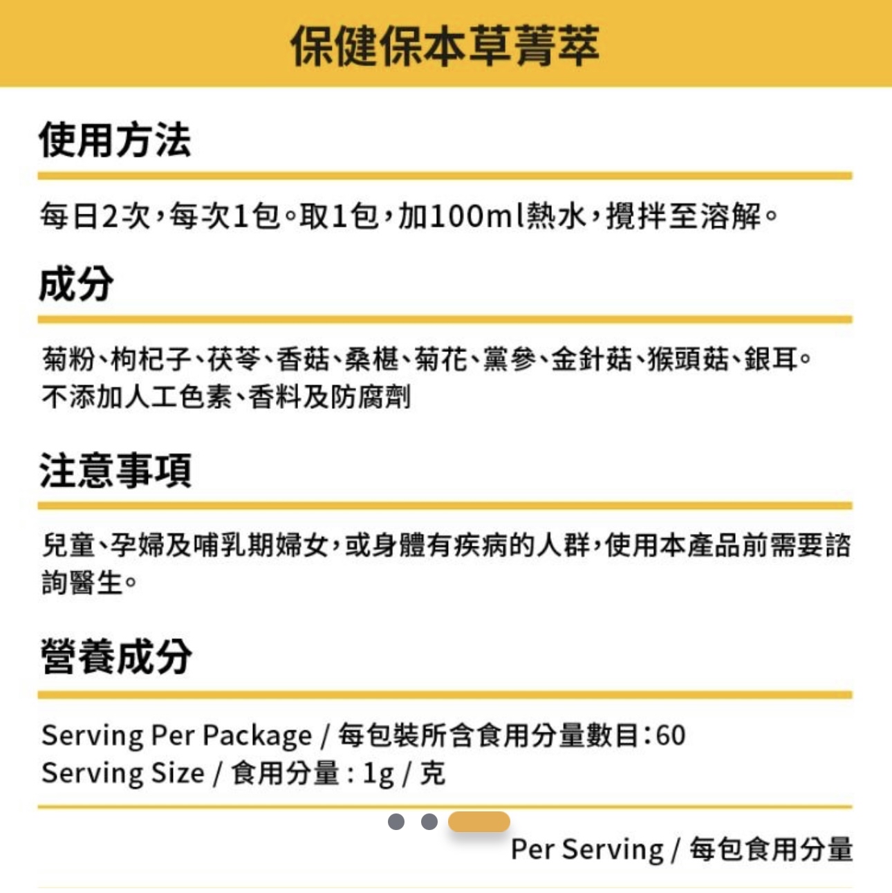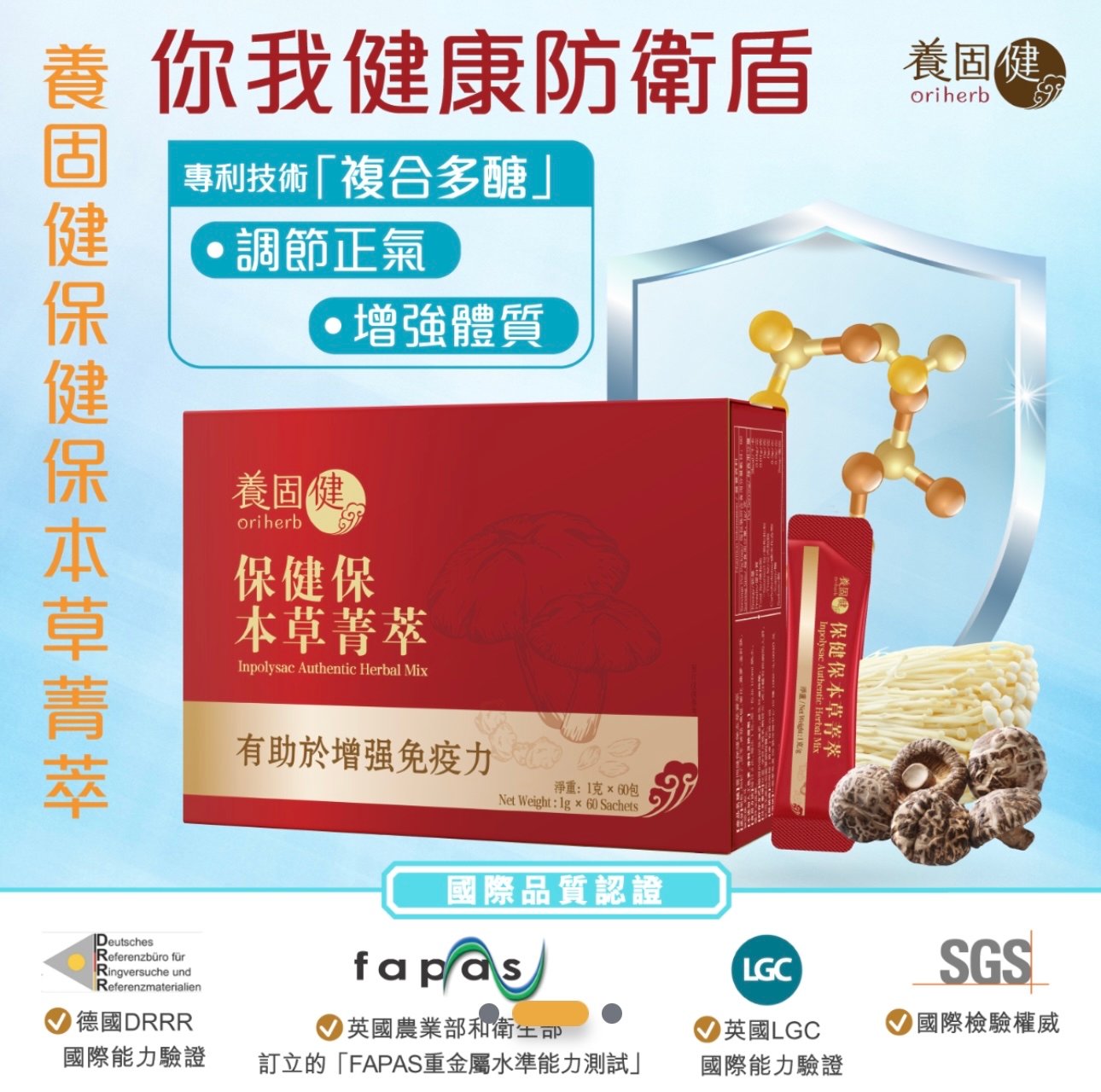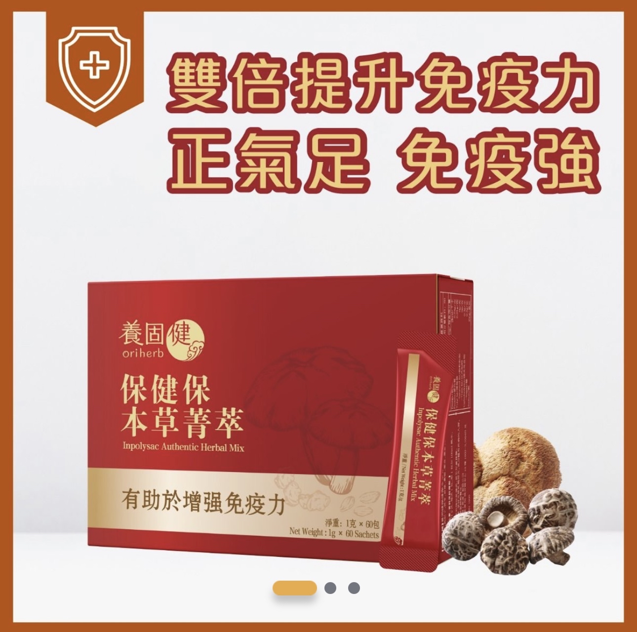 產品介紹 主要功能 - 你的健康防衛盾 - 扶正固本,調節免疫 - 以高品質中草藥原材料製成,萃取其高活性有效成分 - 20 多年精心研發黃金比例的「複合多醣」 - 可被人體高效吸收,增強免疫力 - 美國哈佛醫學院有研究指出特定多醣具有免疫調節功效 - 歐洲科學團隊研究發現,保健保成分之一「香菇多醣」具有免疫調節作用和肺細胞保護作用,幫助緩解肺部氧化壓力,激活巨噬細胞。 榮獲2018年世界品質品鑑大會「銀獎」 - 全新沖泡式粉劑獨立包裝,方便攜帶,即沖即飲 - 粉劑萃取技術有助吸收 - 無添加糖分,無添加色素,無添加防腐劑 - 素食者適用 (可根據個人情況,配搭其他無限極產品服用) 使用方法 每日2次,每次1包。 取1包倒入杯中,加入約100毫升熱水,攪拌至溶解後,即可享用。 可根據個人口味酌情調整水量 成分及包裝劑型 枸杞子、茯苓、香菇、桑椹、菊花、黨參、猴頭菇、金針菇、銀耳、菊粉 產品包裝:1克 × 60包
