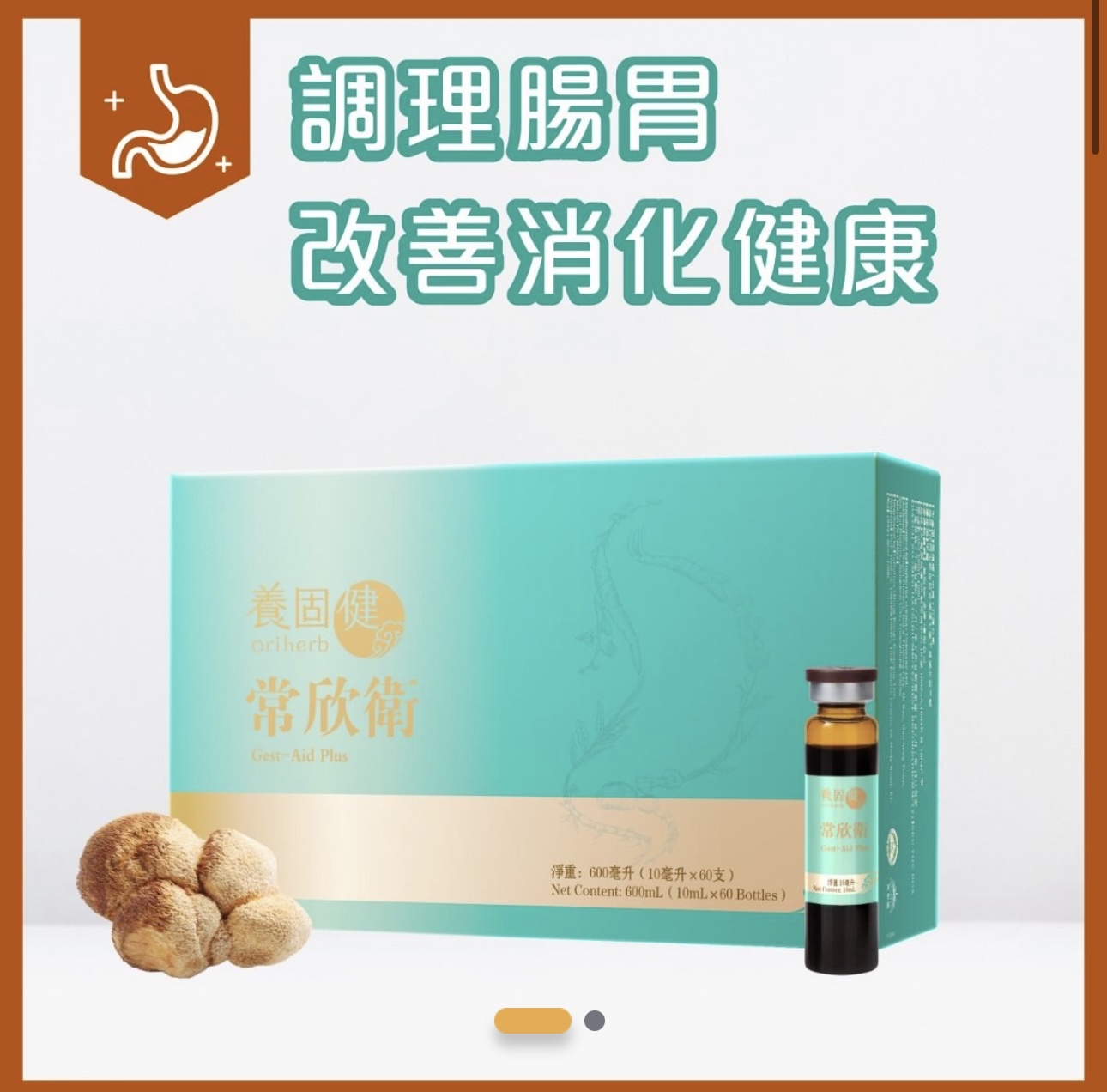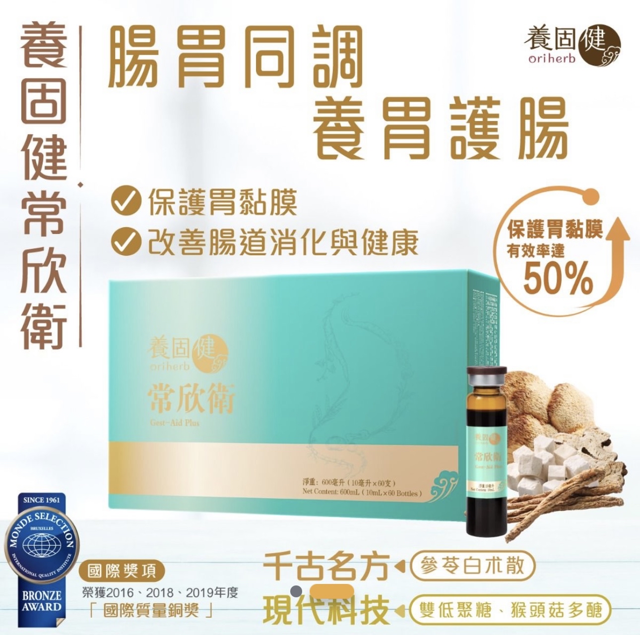 產品介紹 養胃護腸 改善消化 - 借鑒宋代名方「參苓白朮散」,配以現代高科技提取活性成分,增強功效 - 保護胃黏膜,強化胃部抵抗力 - 增加腸道益生菌,提升腸道健康 使用方法 每日2次,每次1支,飲用前請搖勻 成分及包裝劑型 黨參、猴頭菇萃取物、山藥、茯苓、白扁豆、陳皮、砂仁、白朮、白朮低聚木糖、異麥芽低聚醣 其他重要成分 君:黨參、茯苓、白朮 — 補脾健胃 臣:山藥、白扁豆 — 益氣、健脾、滲濕 佐/ 使:陳皮、砂仁 — 化濕、理氣、和胃 低聚木糖、低聚異麥芽糖 — 促進腸道益生菌生長,清除宿便 猴頭菇多醣 — 保護胃黏膜,改善消化功能 產品包裝:10毫升 × 60支