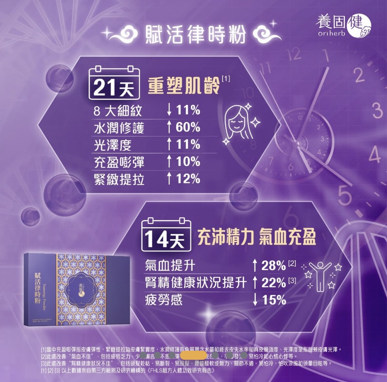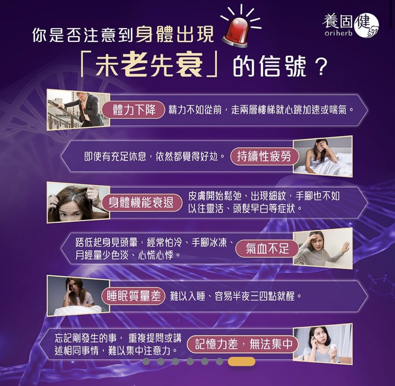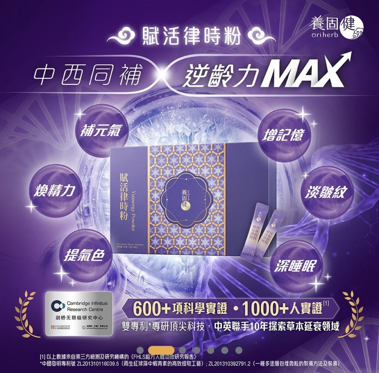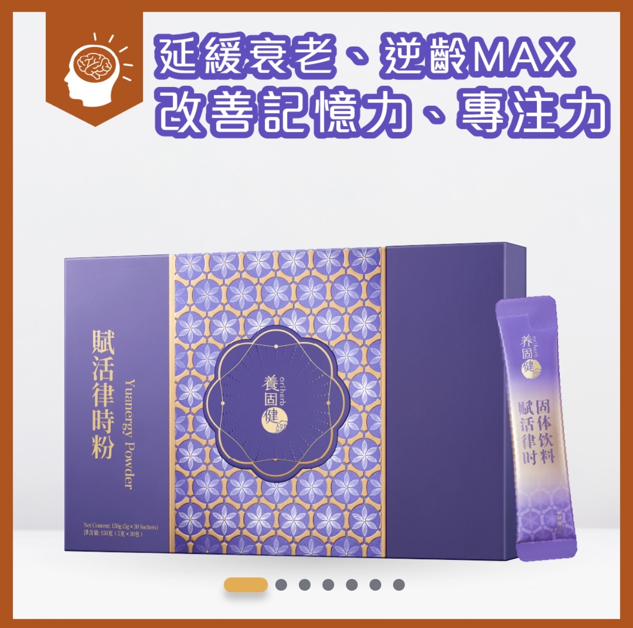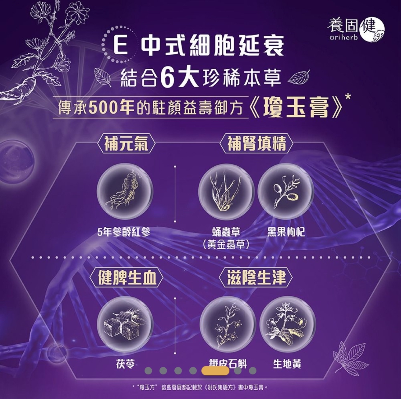 關注問題 抗衰老 產品介紹 借鑒傳承500年駐顏益壽禦方「瓊玉膏」調製,其成分包含5年參齡紅蔘、「黃金蟲草」之稱的蛹蟲草等6大珍稀本草,協同PQQ、蘋果多酚及蝦青素, 激活粒線體能量工廠,從而提高整體抗氧化能力,並修復DNA損傷。 從而幫助延緩衰老,維持年輕狀態。 ◆其他成分及功效: • 5年參齡紅參:補元氣 •蛹蟲草、黑果枸杞:補腎填精 •鐵皮石斛、生地黃:滋陰生津 •茯苓:健脾生血 ◆實現證實^: 100%提升專注力 99%改善記憶力 14天改善疲勞、氣血不佳等症狀。 21天重塑肌齡(改善肌膚細紋、光澤度、水潤度、緊緻度等) 28天提升睡眠質素 ^以上數據來自第三方檢測及研究機構的《FHLS組方人體功效研究報告》 *注意事項:嬰幼兒、兒童、孕婦、哺乳期婦女、食用真菌過敏者等特殊族群不宜食用。患病或身體不適期間請先諮詢醫生或專業人士意見方可食用。此乃日常生活保健食品,並非醫藥品,亦不具醫療功效,產品功效因人而異,圖片只供參考一切以實物為準。 成分及包裝劑型 紅參、蛹蟲草、黑果枸杞、鐵皮石斛、生地黃、茯苓、PQQ等。 產品包裝:5g×30條